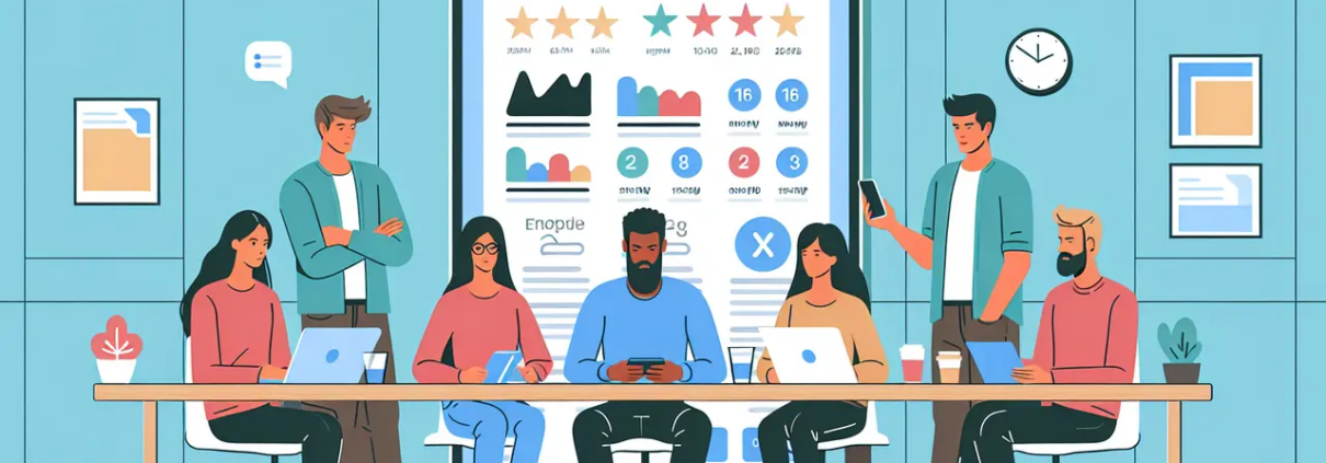 Draw a graphic in flat design style. A group of diverse developers collaborating at a table with a large smartphone screen displaying app analytics and ratings in a minimalist office setting.