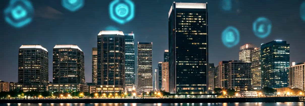 A vibrant Richmond skyline with digital technology icons overlay. 35mm stock photo